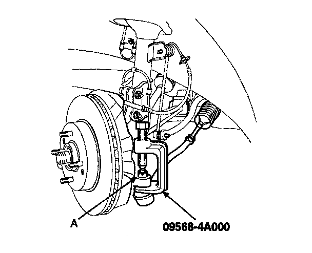 5. Disconnect the tie rod end ball joint (A) from the knuckle using a special tool (09568 - 4A000).