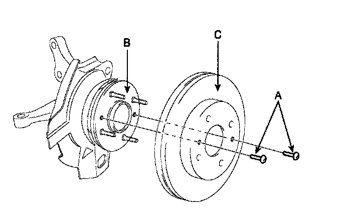 1. After removing the fixed screws(A) mounting the brake disc(C), remove the brake disc(C) from the hub(B).