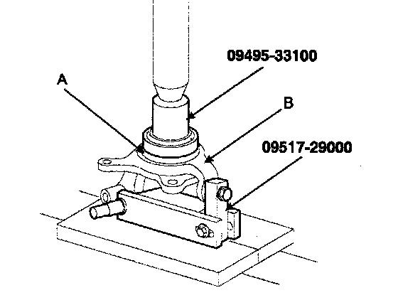 7. Using the special tools (09495-33100.9517-29000), remove the wheel bearing outer race(A) from the knuckle(B).