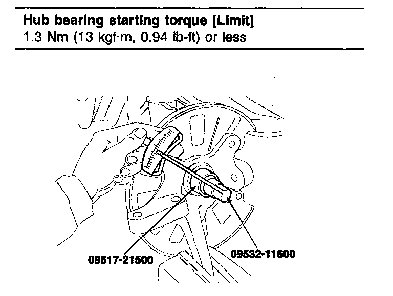 7. If the starting torque 0 Nm (0 kg-cm, 0 lb-ft), measure the hub bearing axial play.