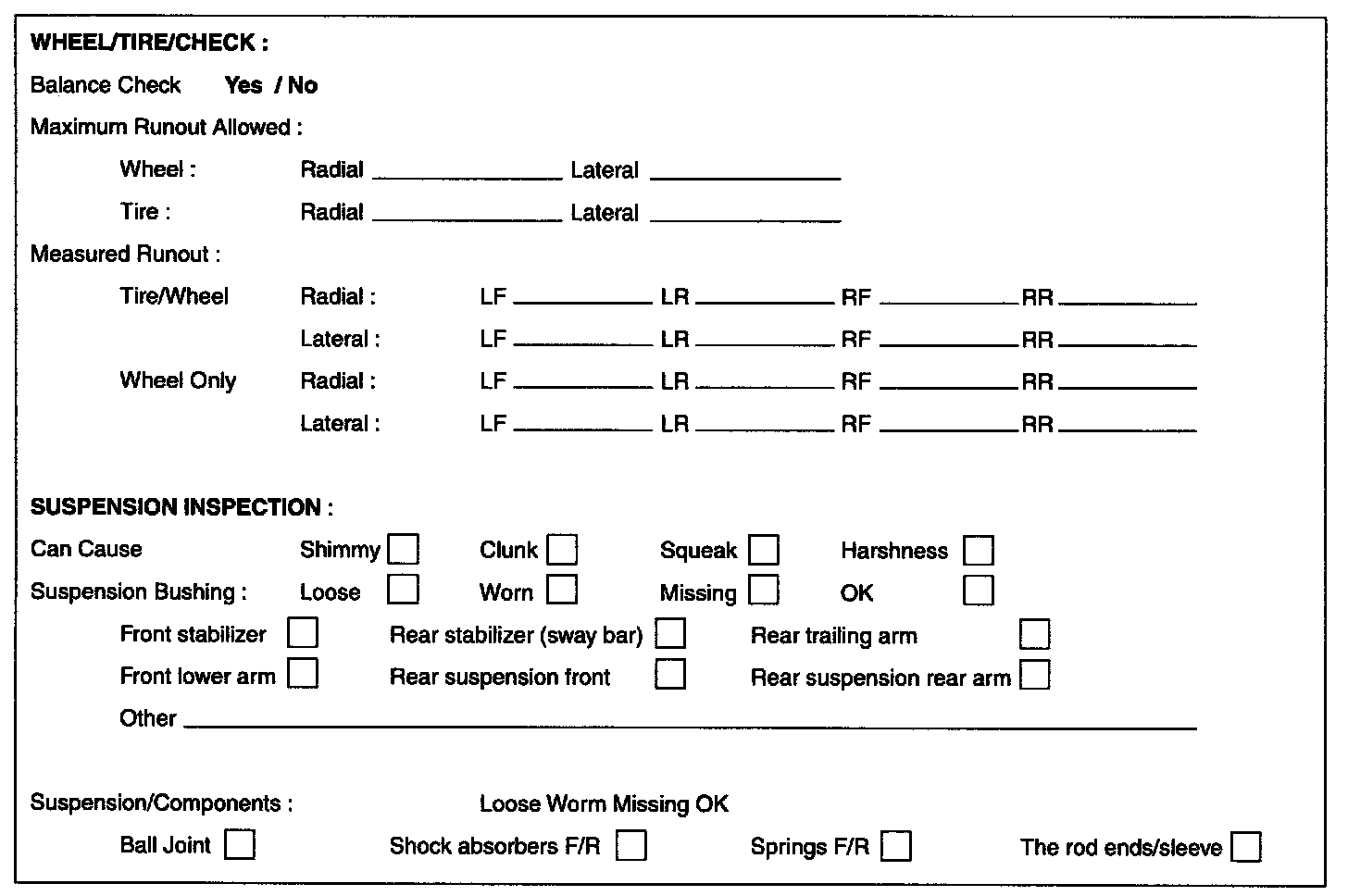 VEHICLE INSPECTIONTo assist the service advisor and the technician, check the suspension and wheel/tire condition with the questions listed below by filling them. It serves as a place to record information as well as data from the test to be carried out. To begin a successful diagnosis, fill out the questions.