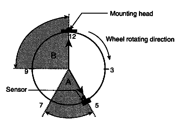 B: If the sensor reaches the 9 to 12 o'clock position prior to the tire engaging the wheel, please stop and reposition the sensor to the 5 o'clock position before continuing the tire mounting process.