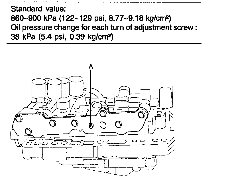 7. Turn the adjustment screw(A) of the regulator valve and adjust so that the line pressure (kickdown brake pressure) reaches the standard value. When the adjustment screw is turned clockwise, the line pressure becomes lower; when it is turned counter-clockwise, it becomes higher.