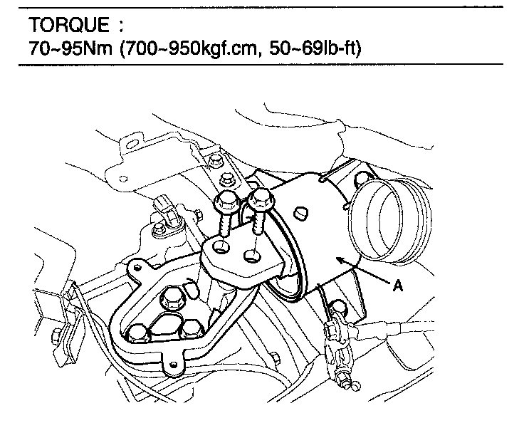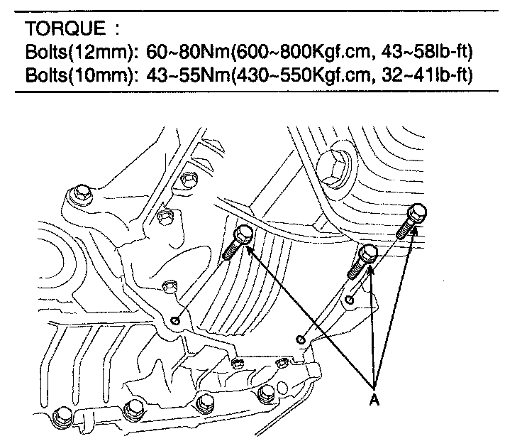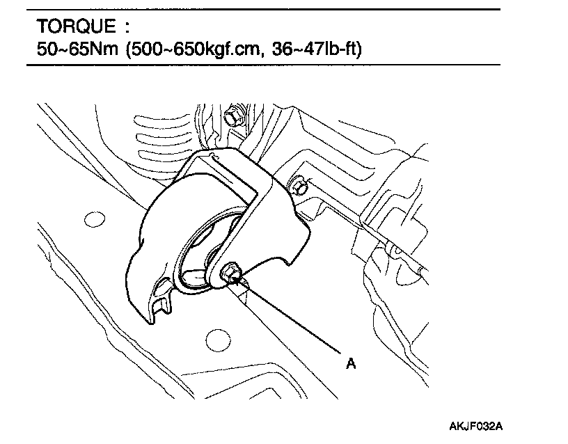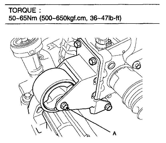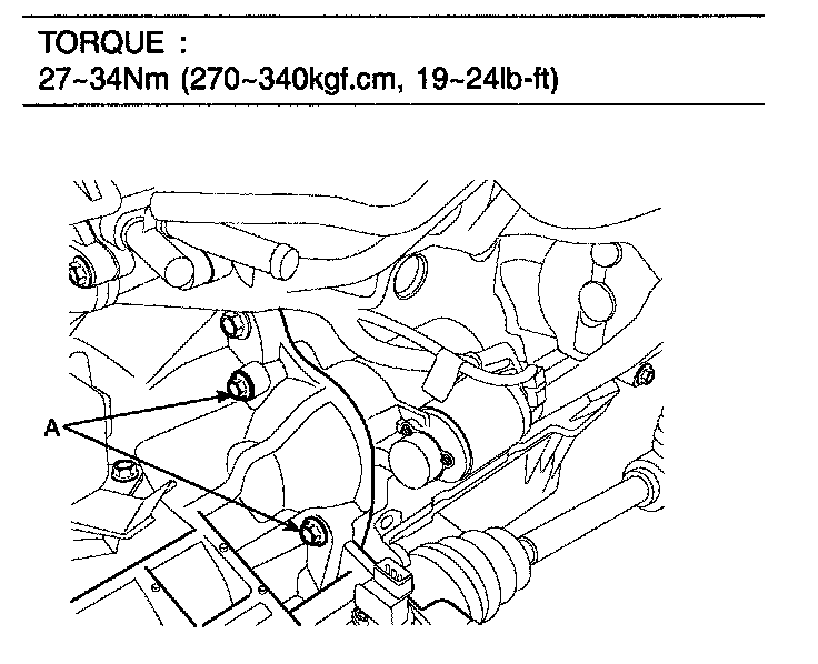 27. Remove the engine to automatic transaxle mounting bolts(A).