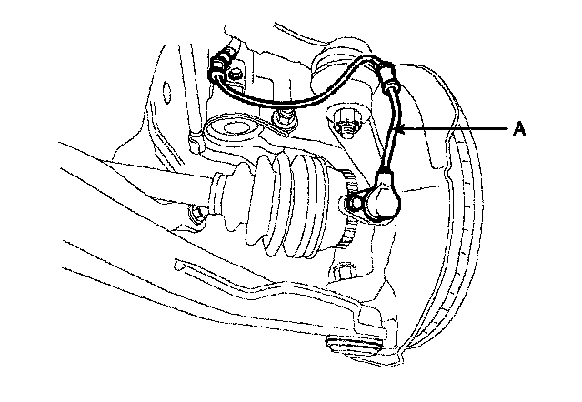 19. Remove the front caliper(A) and use a wire to secure the caliper to the vehicle so that it is out of the way.