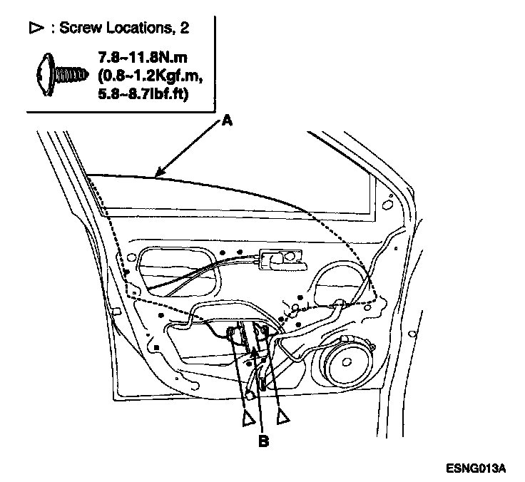 3. Carefully move the glass (A) until you can see the bolts, then loosen them. Separate the glass from the glass run and carefully pull the glass out through the window slot (B).