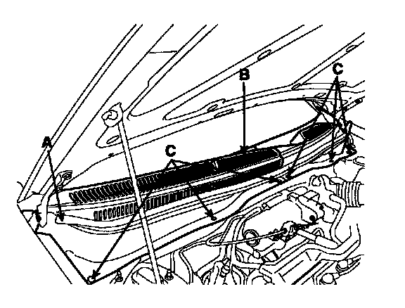 2. Remove the weather strip (A) then remove the cowl top cover (B) after removing 6 clips (C).
