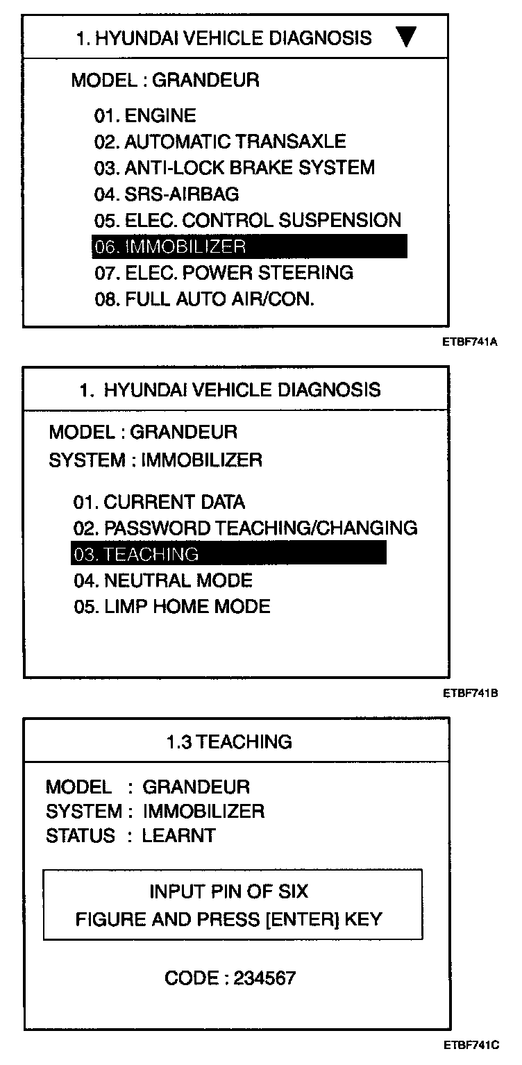 The procedure starts with an PCM (ECM) request for vehicle specific data (PIN code: 6 digits) from the tester. The "virgin" PCM (ECM) stores the vehicle specific data and the key teaching can be started. The "learnt" PCM (ECM) compares the vehicle specific data from the tester with the stored data. If the data are correct, the teaching can proceed.