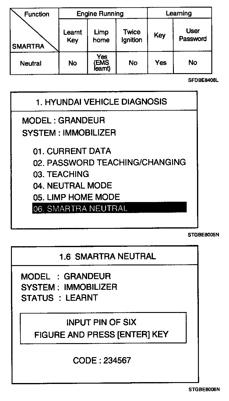 Ignition key (regardless of key status) is inserted and after IGN ON. It receiving the correct vehicle password from GST, SMARTRA can be neutralized. The neutralization of SMARTRA is possible if DPN is same as the value inputted by GST.