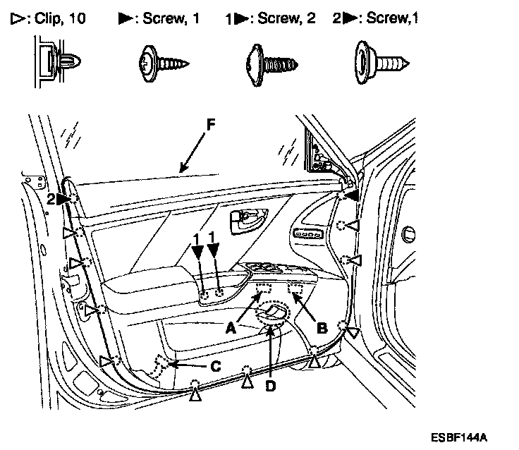 3. Loosen the door trim (F) mounting screws. Release the clips that hold the door trim, then remove the door trim by pulling it upward. Disconnect the power window switch connector (A), power mirror connector (B), and door courtesy lamp connector (C), trunk lid connector (D).
