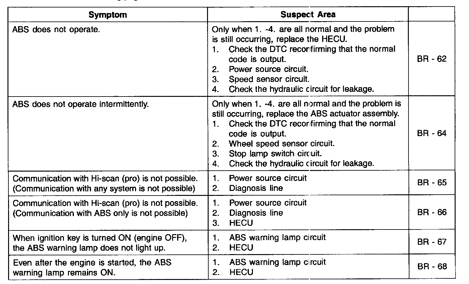 PROBLEM SYMPTOMS TABLEIf a normal code is displayed during the DTC check that the problem still occurs, check the circuits for each problem symptom in the order given in the table below and proceed to the relevant troubleshooting.