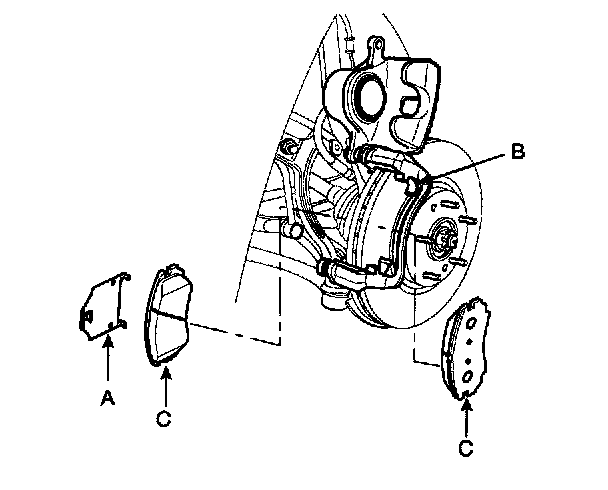 3. Remove pad shim(A), pad retainer(B) and pad assembly(C) in the caliper bracket.