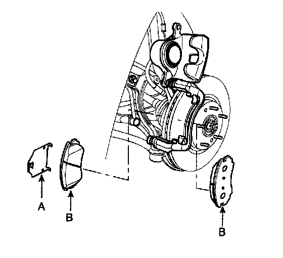 2. Install pad shims(A) and the brake pads(B) with the wear indicator on the inside.
