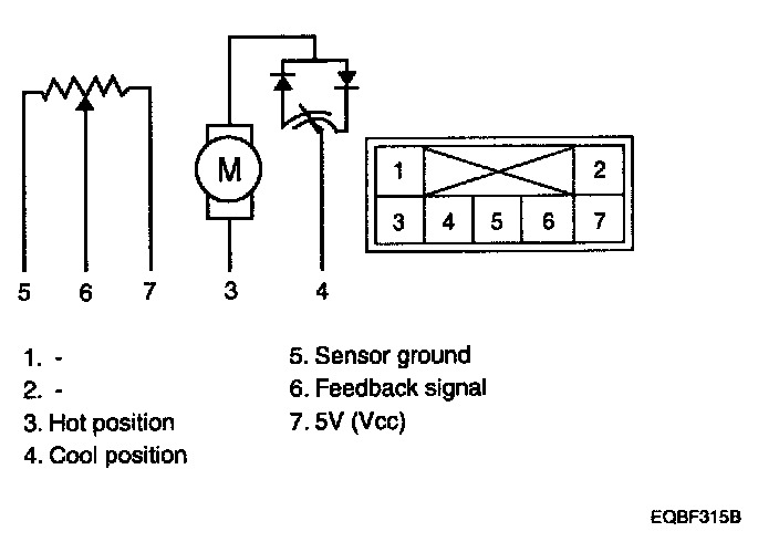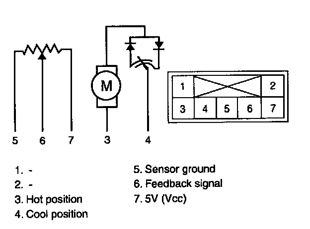 1. Verify the temperature control actuator operates to the hot position when connecting 12 V to the terminal 3 and grounding terminal 4.