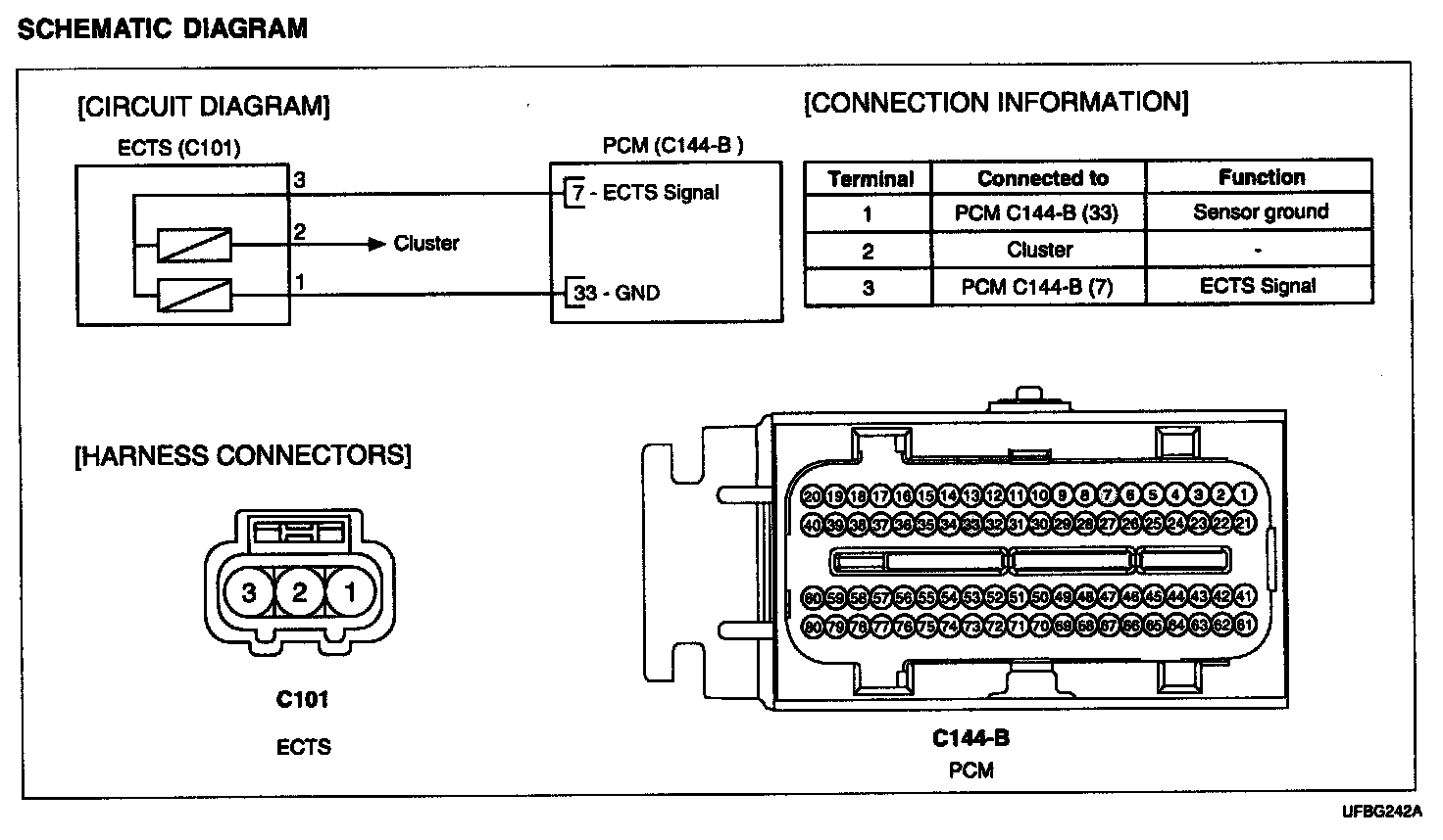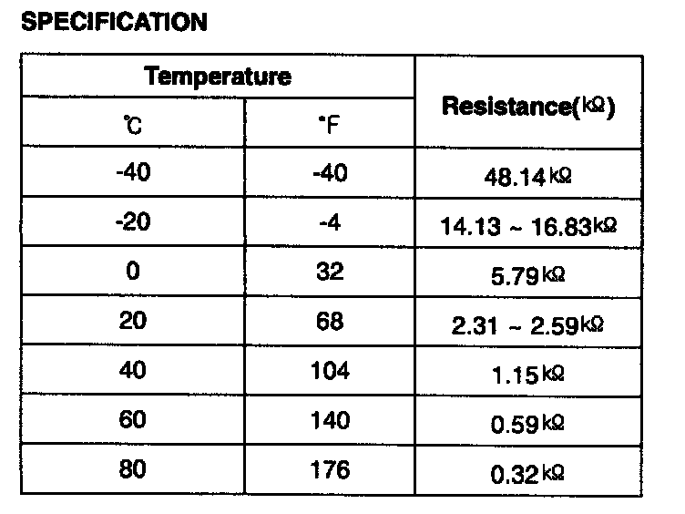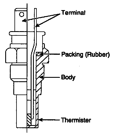 Engine Coolant Temperature Sensor (ECTS) is located in the engine coolant passage of the cylinder head for detecting the engine coolant temperature. The ECTS uses a thermistor whose resistance changes with the temperature. The electrical resistance of the ECTS decreases as the temperature increases, and increases as the temperature decreases. The reference 5 V in the PCM is supplied to the ECTS via a resistor in the PCM. That is, the resistor in the PCM and the thermistor in the ECTS are connected in series. When the resistance value of the thermistor in the ECTS changes according to the engine coolant temperature, the output voltage also changes. During cold engine operation the PCM increases the fuel injection duration and controls the ignition timing using the information of engine coolant temperature to avoid engine stalling and improve drivability.