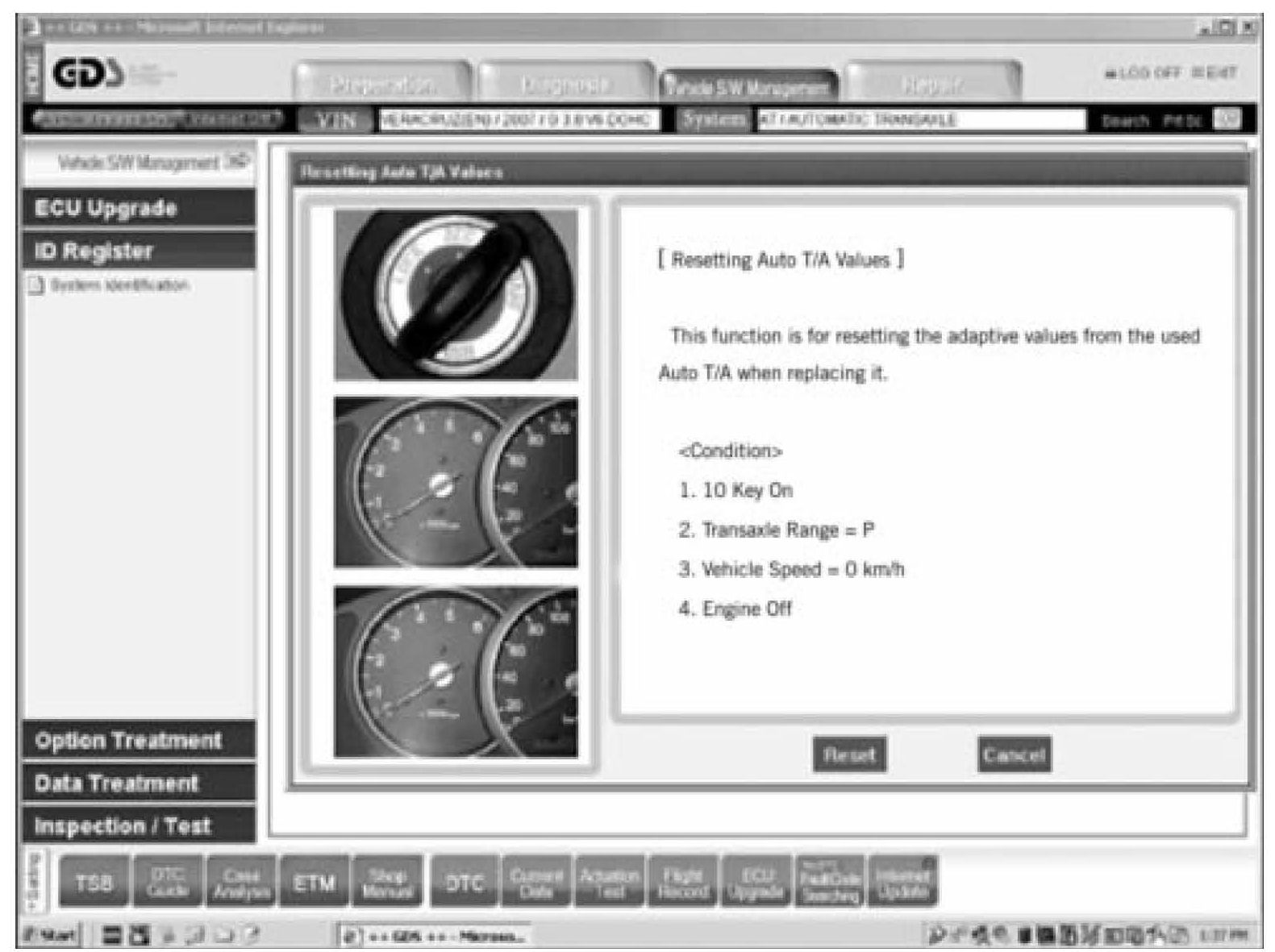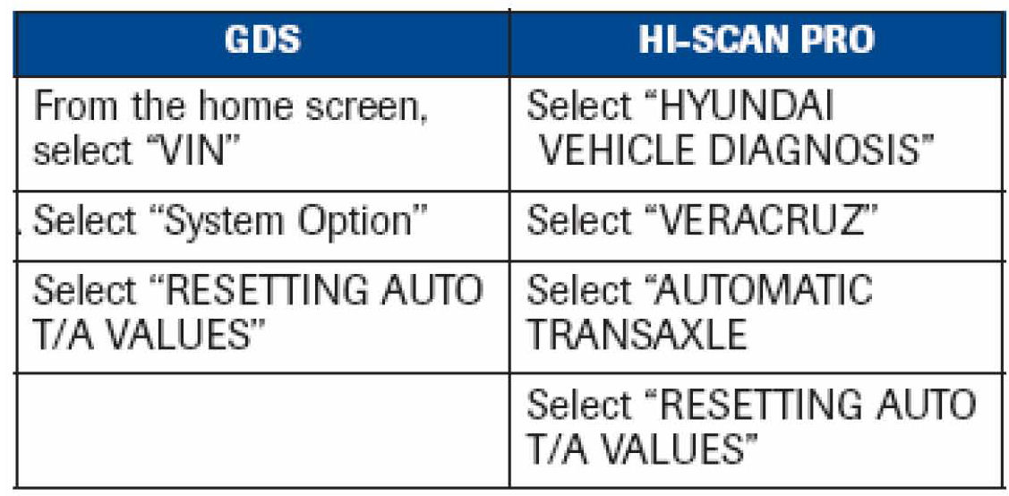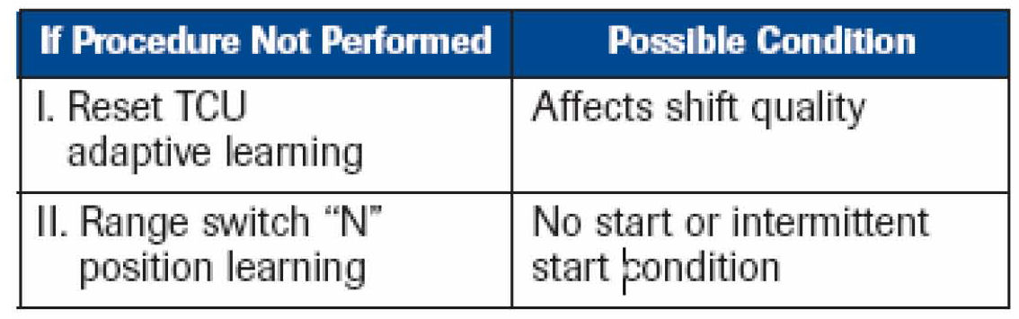 If the transaxle or transaxle control unit is replaced, the TCU adaptive learning values must be reset (erased) and the range switch neutral position must be relearned using either the GDS or Hi-Scan Pro. If the following procedures are not completed, the following conditions may occur: