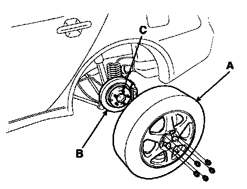 Be careful not to damage the hub bolts(C) when removing the rear wheel and tire(A).