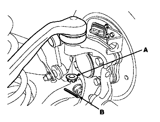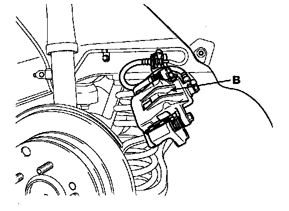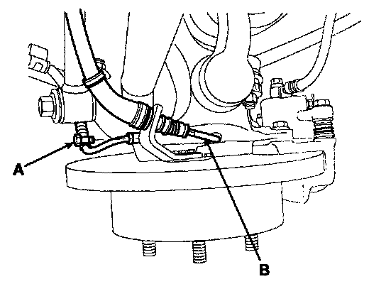 3. Remove the wheel speed sensor bolt(A) and the parking brake cable(B).