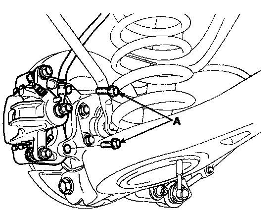 4. Remove the brake caliper mounting bolts(A), and then place the brake caliper assembly with wire as shown in the illustration.