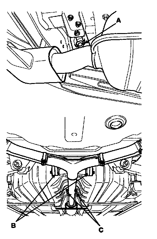 6. Remove the four rear muffler mounting rubbers(A,B) and the connecting bolts(C).