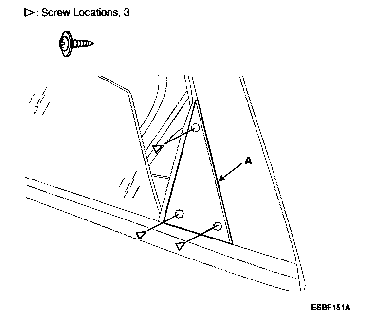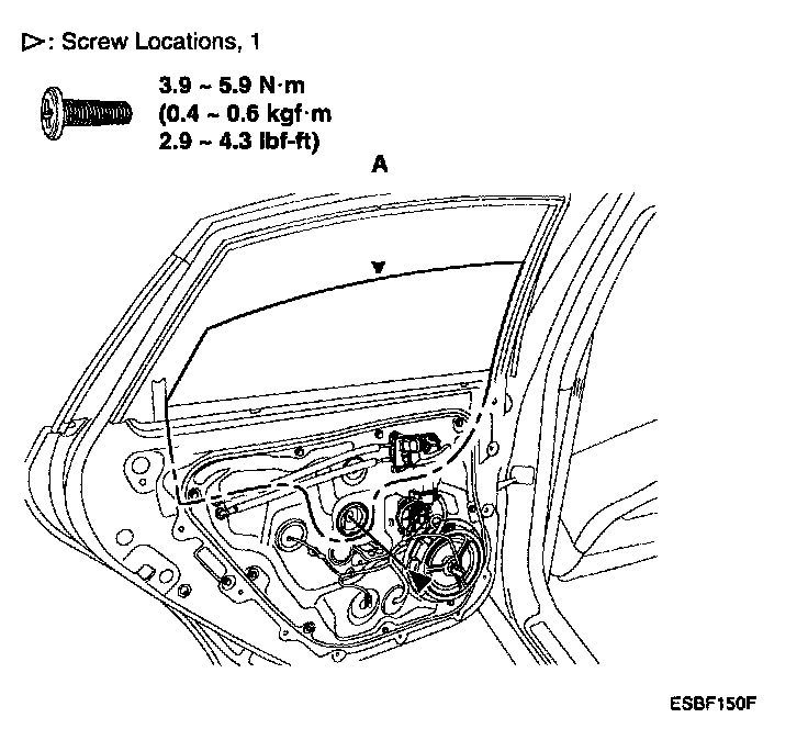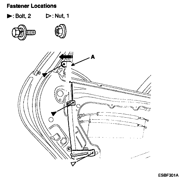 4. Carefully move the glass (A) until you can see the bolts, then loosen them. Separate the glass from the glass run and carefully pull the glass out through the window slot.