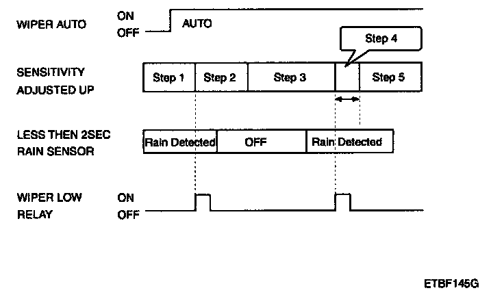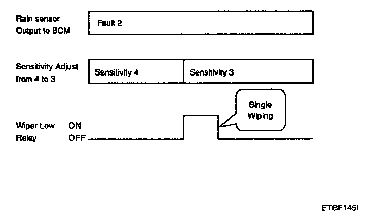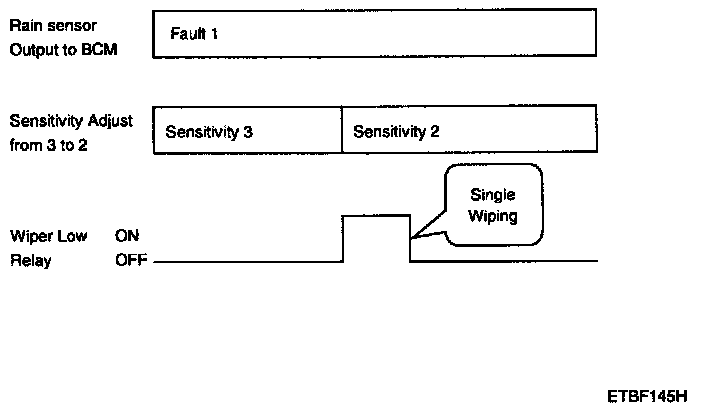 4. The drive may adjust the rain sensor performance by adjusting the sensitivity input. When in automatic mode, the BCM will perform a single wipe each time the sensitivity is adjusted upward to a more sensitive setting (downward more then one step). This single wipe will only be performed if Rain Detected signal is being received from the Rain sensor. If the sensitivity adjustment is adjusted upward more than one sensitivity, the BCM will only perform a single wipe unless the time between Increases is more than 2 seconds.