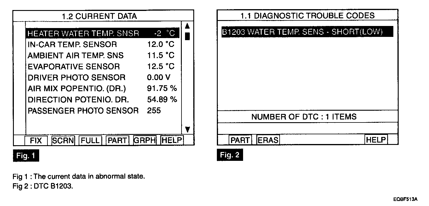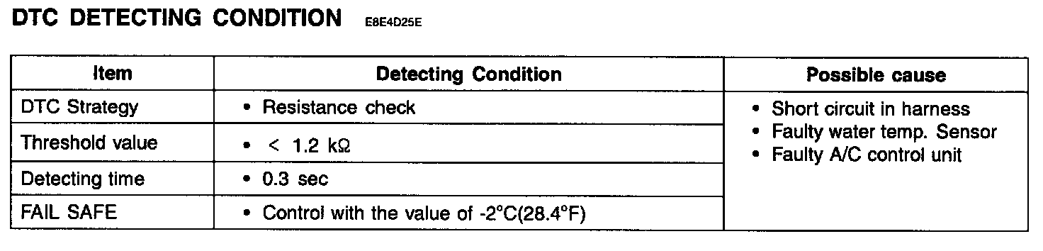 The A/C controller sets DTC B1203 if there is a short circuit in water temp. sensor signal harness or the measured resistance value of sensor is less than threshold value (about 1.2 kohm)