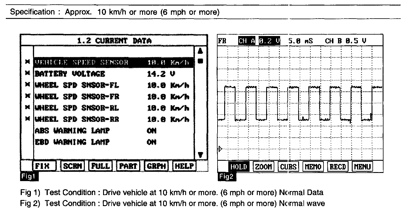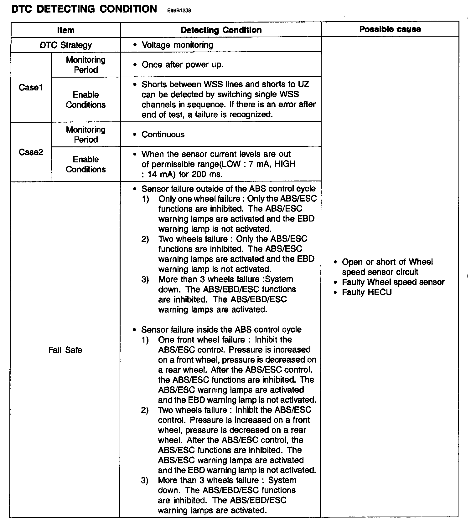 The ABS ECU monitors the wheel speed sensor circuit continuously. A direct current is supplied in the wheel-speed sensor by a power source in the input amplifier of the control unit. If the WSS circuit is broken, in that case a fault is detected by detecting abnormal input current. HECU cuts off the voltage supply to wheel sensor channel which had a fault to prevent vehicle's damage due to super heated harness. If one or more defects has detected, DTC code of defected wheel will be stored. Mutual short between sensors is detected by executing self diagnosis successively at corresponding wheel when ignition ON. Warning lamp is turned OFF unless fault is detected any more when the IG KEY is turned ON again.