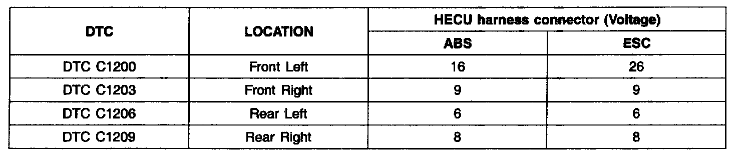 ^ Check for open or short to GND in wheel speed sensor harness between terminal (front:"2", rear:"1") of the wheel speed sensor harness connector and terminal of the HECU harness connector. Repair as necessary and then go to "Verification of vehicle Repair" procedure.