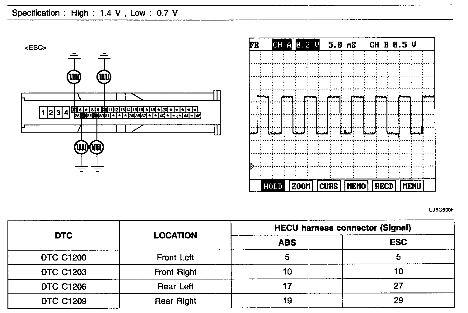 4. Measure wave between terminal of the HECU harness connector and chassis ground.