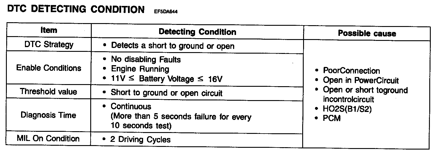 If the PCM detects short to ground or open in heater under detecting conditions, PCM sets P0037. MIL (Malfunction Indication Lamp) turns on when the malfunction lasts till consecutive 2 driving cycle.