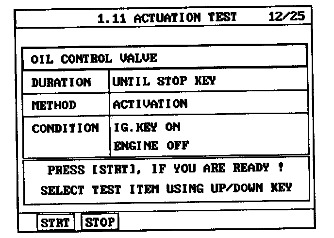 3. Activate "OCV" by pressing "STRT(F1)" key, (should hear a faint click from Oil Control solenoid Valve)