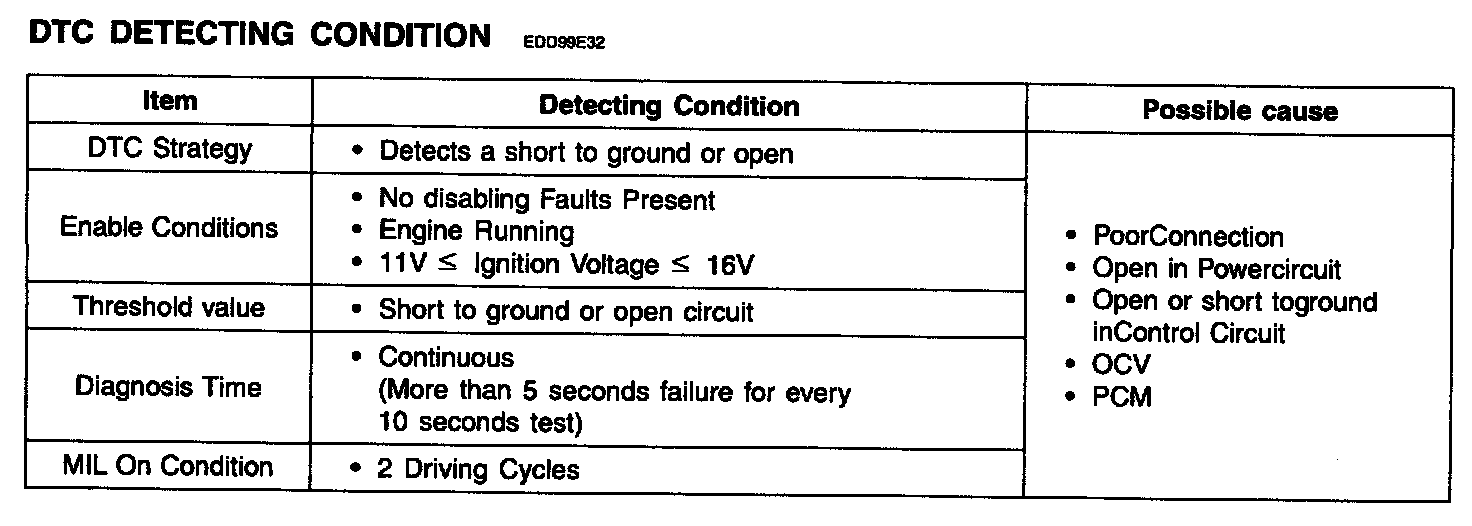 When the enable condition is satisfied, The PCM checks that CCV outputs (Voltage level) are observed when OCVs are commanded. When a OCV output failure is detected, the appropriate fail counter is incremented. If the failure threshold is exceeded 5 seconds during one diagnostic test (10 seconds), the test is failed and DTC is stored. MIL (Malfunction Indication Lamp) turns on when the malfunction lasts till consecutive 2 driving cycle.