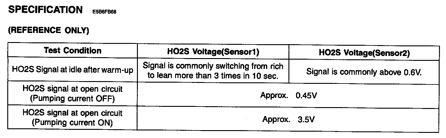 In order to control emissions of the CO, HC and NOx components of the exhaust gas, heated oxygen sensor (HO2S), mounted on the front side and rear side of catalytic converter, detects the oxygen content in the exhaust gas. The front HO2S signal is used to control air/fuel ratio (closed loop fuel control) and the rear HO2S signal is used to monitor front HO2S and catalyst for proper operation. The HO2S requires a minimum temperature to operate properly and provide a closed loop fuel control system. The HO2S contains the heater element to reduce its warming-up time and ensure its performance during all driving conditions. The oxygen sensor generates a voltage that indicates the difference between the oxygen content of the exhaust stream and the oxygen content of ambient air. When the exhaust stream is "rich," there is more oxygen in the ambient air than in the exhaust stream, so the voltage will be higher.