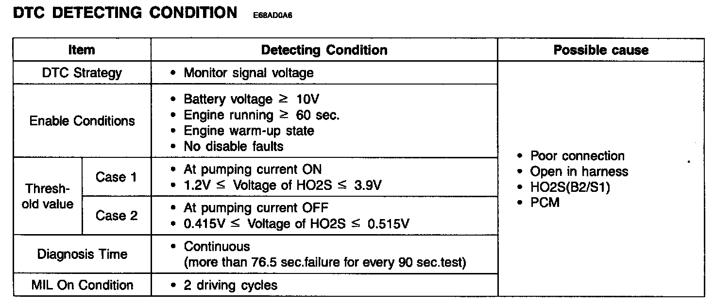 Checking output signals from HO2S under detecting condition, if an output voltage is approx. 0.45 V or 3.5 V for more than predeterminate time, PCM sets P0154. MIL (Malfunction Indication Lamp) turns on when the malfunction lasts till consecutive 2 driving cycle.