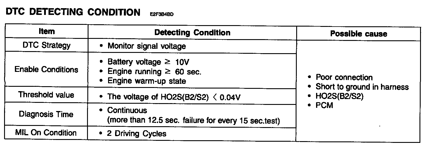 Checking output signals from HO2S under detecting condition, if an output signal is below 0.04 V for more than predeterminate time, PCM sets P0157. MIL (Malfunction Indication Lamp) turns on when the malfunction lasts till consecutive 2 driving cycle.