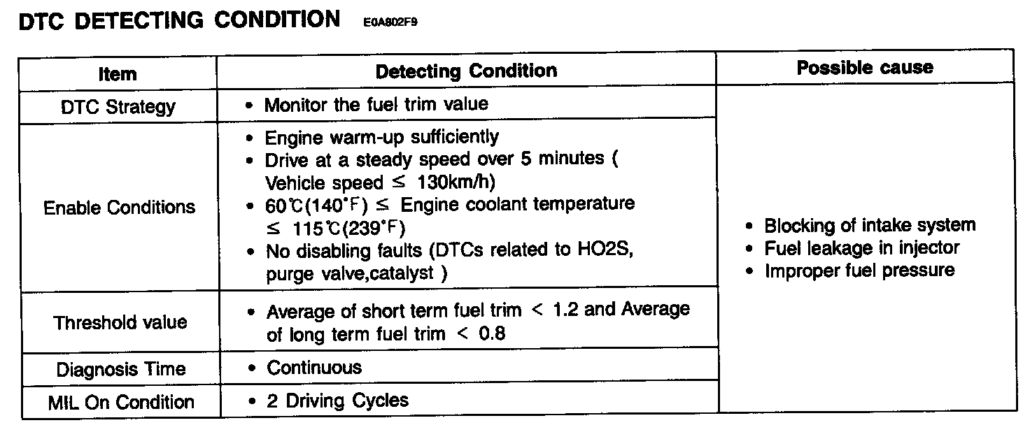 Checking the fuel time value under detecting condition, if its average exceeds the limit over certain period, PCM sets P0172. MIL (Malfunction Indication Lamp) turns on when the malfunction lasts till consecutive 2 driving cycle.
