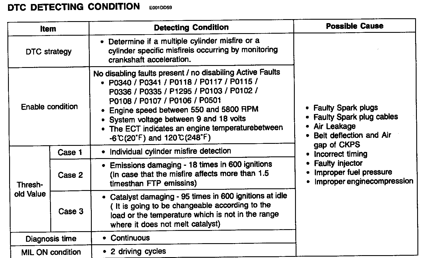 Misfires can be caused by lack of combustion in a cylinder due to absence of spark, poor fuel metering, poor compression, or many other causes. Even a small number of misfires may result in excessive exhaust emissions due to the unburned mixture. Increased misfire rates cause damage to the catalytic converter. The PCM monitors the crankshaft speed variation to determine if any misfiring generated. The PCM identifies the specific cylinder in which the misfire has occurred and counts individual misfire events by monitoring changes in the crankshaft rotation for each cylinder. A random misfire indicates two or more cylinders are misfiring.