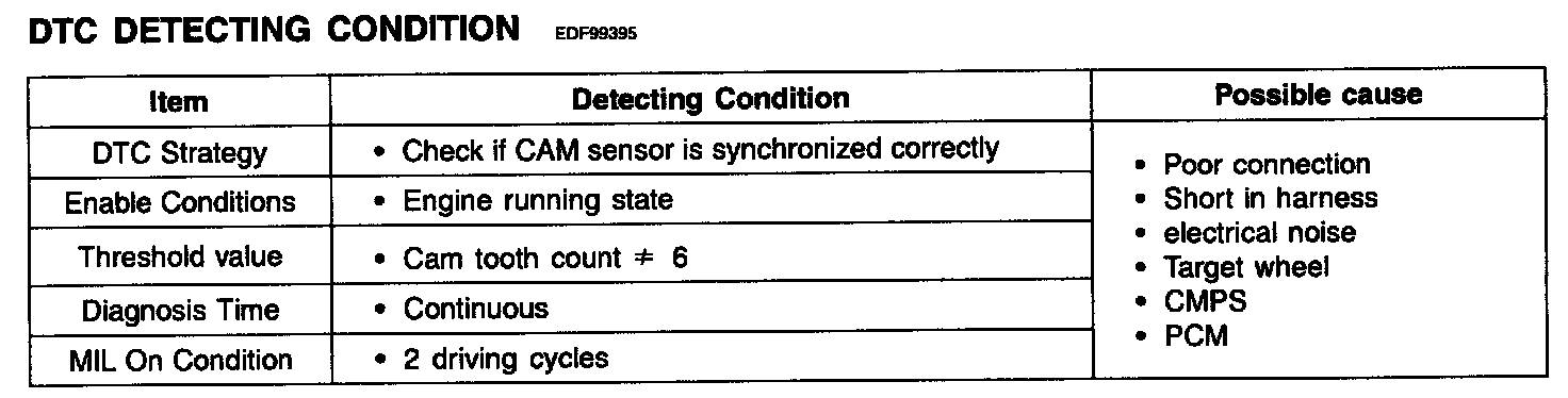 Checking output signals from CMP during engine running, if the expected number of cam tooth count is not observed, PCM sets P0341. MIL (Malfunction Indication Lamp) turns on when the malfunction lasts till consecutive 2 driving cycle.