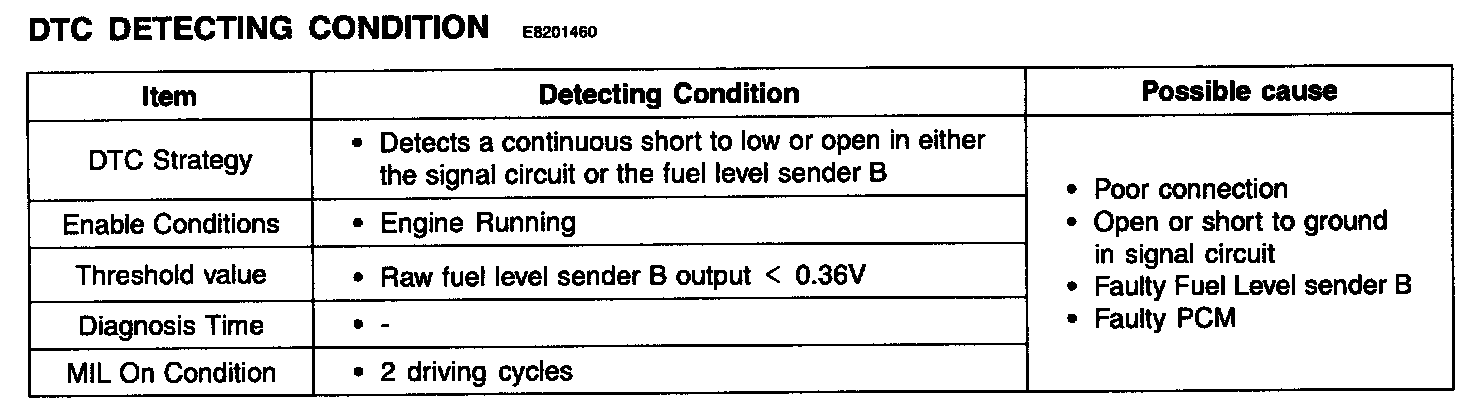 Checking output signals of fuel level sender B under detecting condition, if the fuel level voltage is low than 0.36 V, PCM sets P0462. MIL (Malfunction Indication Lamp) turns on when the malfunction lasts till consecutive 2 driving cycle.