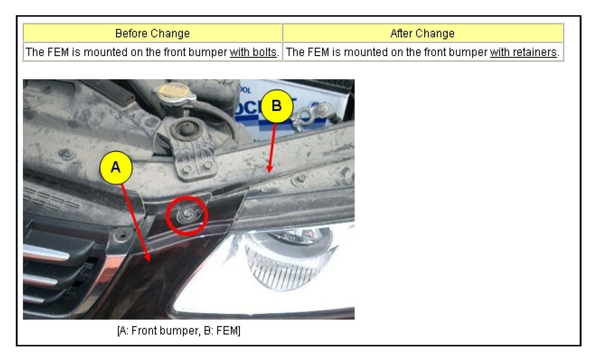 On Azera (TG) vehicles produced since Feb 15, 2008, the Front End Module(FEM) is assembled to the front bumper using retainers.