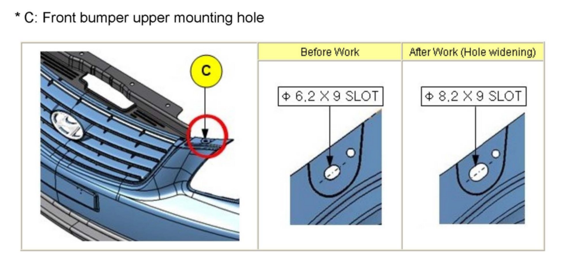 1. When replacing the FEM carrier only, widen the front bumper upper mounting holes as shown in the diagram (increase from 6.2 X 9 mm to 8.2 X 9 mm) and then mount the FEM carrier onto the front bumper with the appropriate retainers.