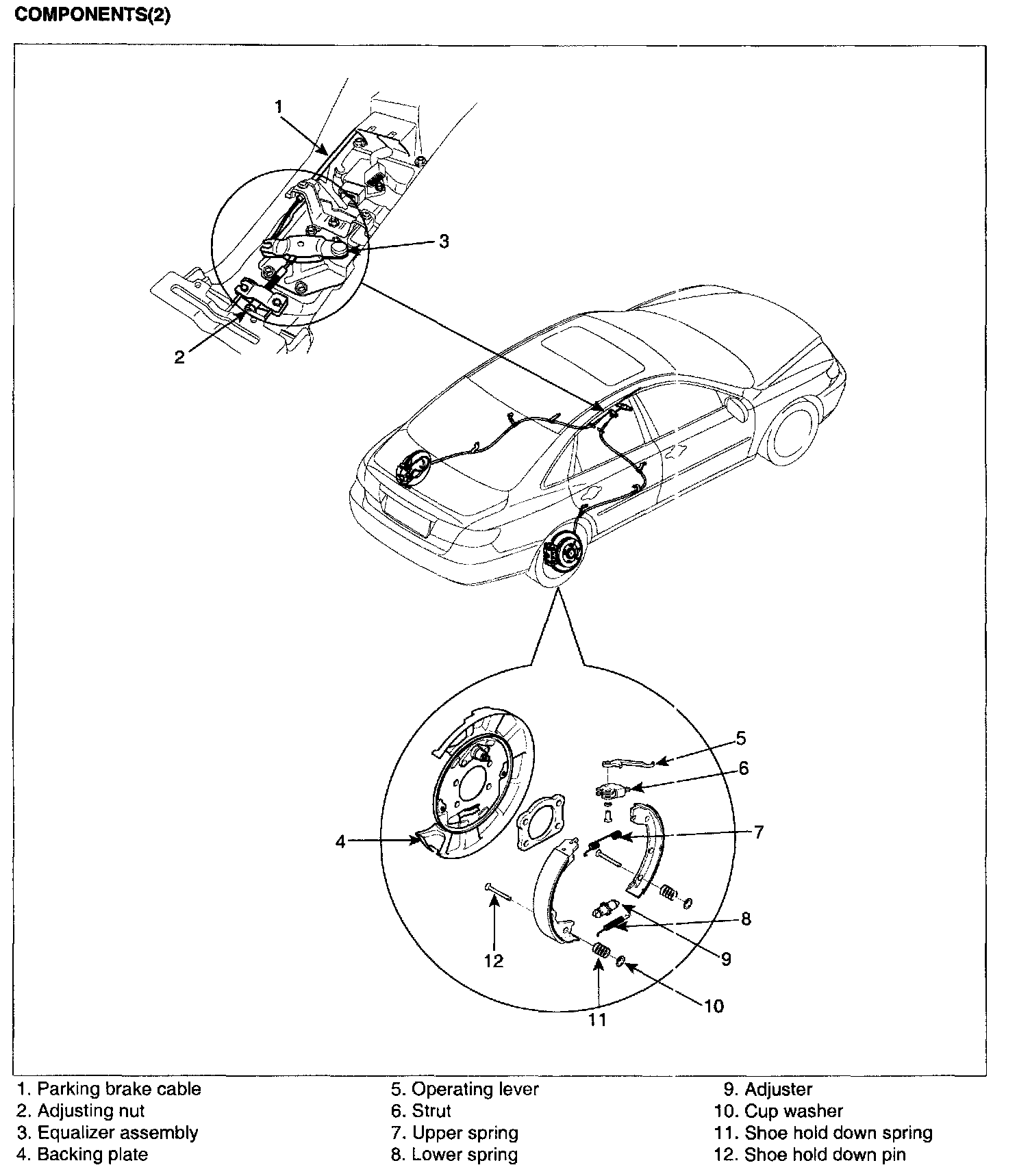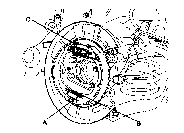 13. Remove the parking brake wire connecting hook(C) from the brake shoe.