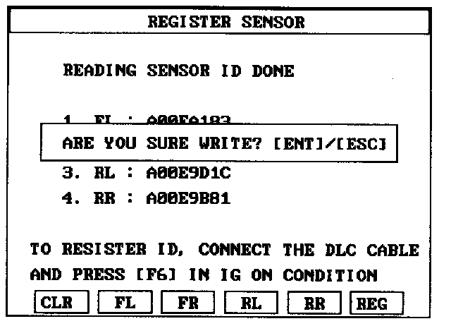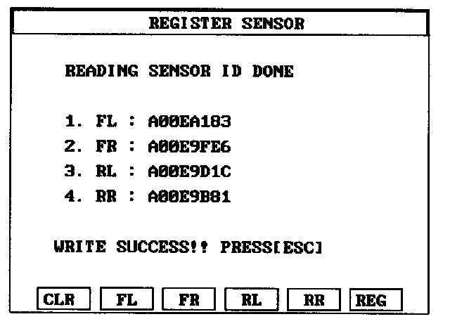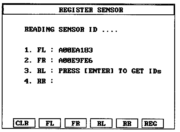 1. Read the four sensor's ids starting with sensor 1 (1 normally front left, 2 front right, 3 rear left, 4 rear right).