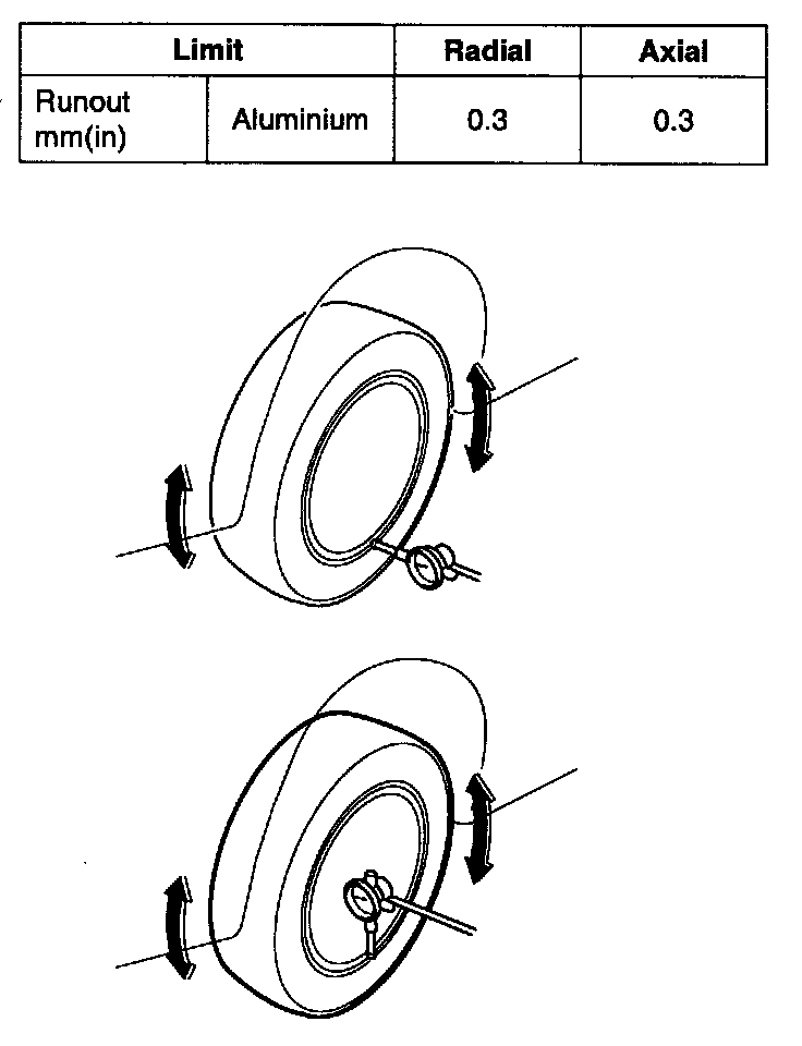 Measure the wheel runout with a dial indicator as illustrated.