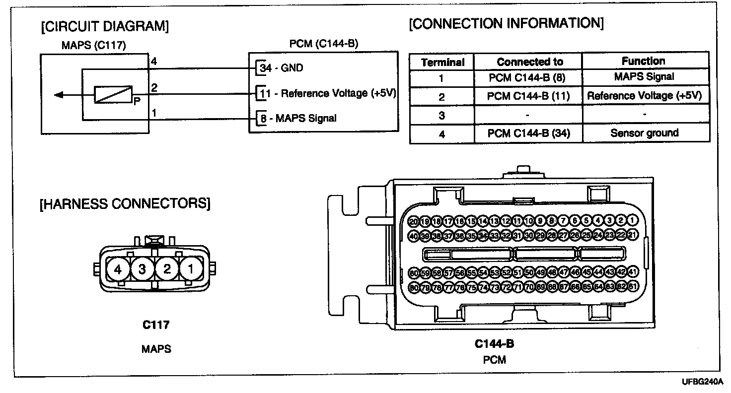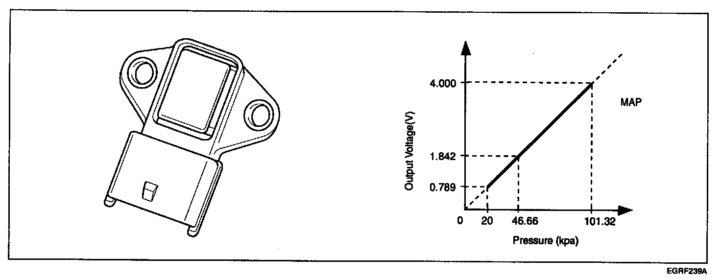 Manifold Absolute Pressure Sensor (MAPS) is speed-density type sensor and is installed on the surge tank. This MAPS senses absolute pressure in surge tank and transfers this analog signal proportional to the pressure to the PCM. The PCM calculates the intake air quantity and engine speed based on this signal. This MAPS consists of piezo-electric element and hybrid IC that amplifies the element output signal. The element is silicon diaphragm type and adapts pressure sensitive variable resistor effect of semi-conductor. 100 % vacuum and the manifold pressure applies to both sides of it respectively. That is, this sensor outputs the silicon variation proportional to pressure change by voltage.