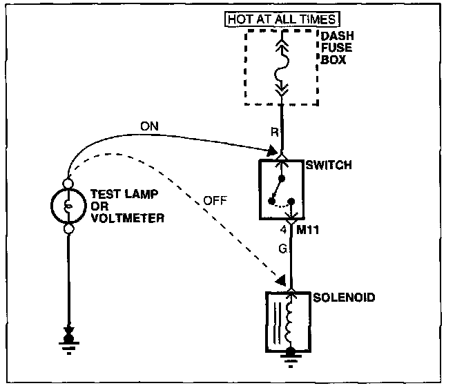 a. Connect one lead of a test lamp or voltmeter to a ground. If you are using a voltmeter, be sure it is the voltmeter's negative test lead you have connected to ground.