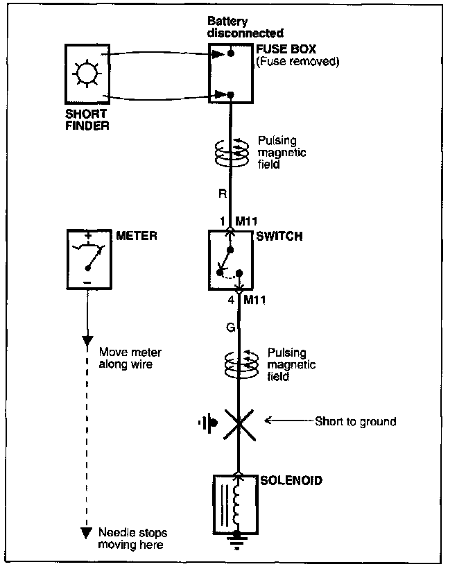 e. Beginning at the fuse box, slowly move the short finder along the circuit wiring. The meter will show current pulses through sheet metal and body trim. As long as the meter is between the fuse and the short, the needle will move with each current pulse. Once the meter is moved past the point of the short, the needle will stop moving. Check around this area to locate the cause of the short circuit.