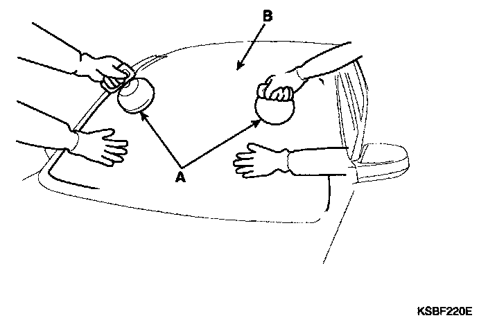 9. Use suction cups (A) to hold the windshield over the opening, align it with the alignment marks (B) made in step 15, and set it down on the adhesive. Lightly push on the windshield until its edges are fully seated on the adhesive all the way around. Do not open or close the doors until the adhesive is dry.