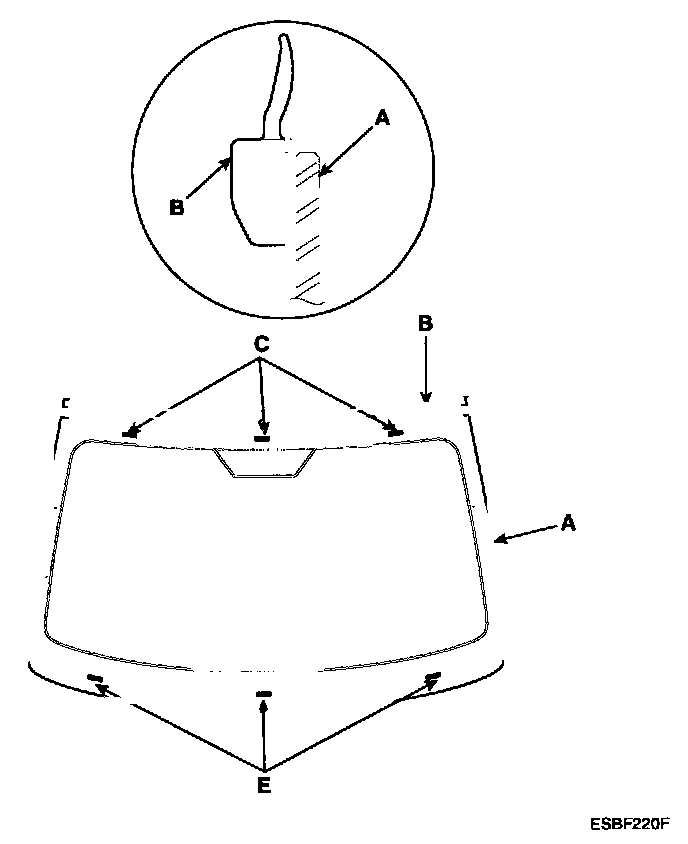 3. Install the windshield (A) upper molding (B) and fasteners (C). Do not allow any gaps.